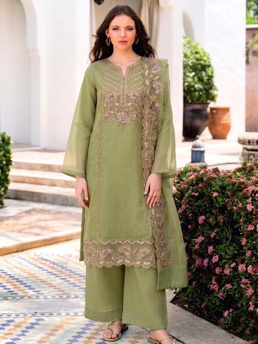 Step into luxury with this Eshaal Luxe Organza Suit, crafted for women who love elegance and sophistication. Made from high-quality organza fabric, this outfit features delicate embroidery that enhances its graceful appeal. The sheer texture and lightweight feel make it perfect for weddings, festive occasions, and evening events. The beautifully designed dupatta adds a regal touch, completing the ensemble effortlessly.